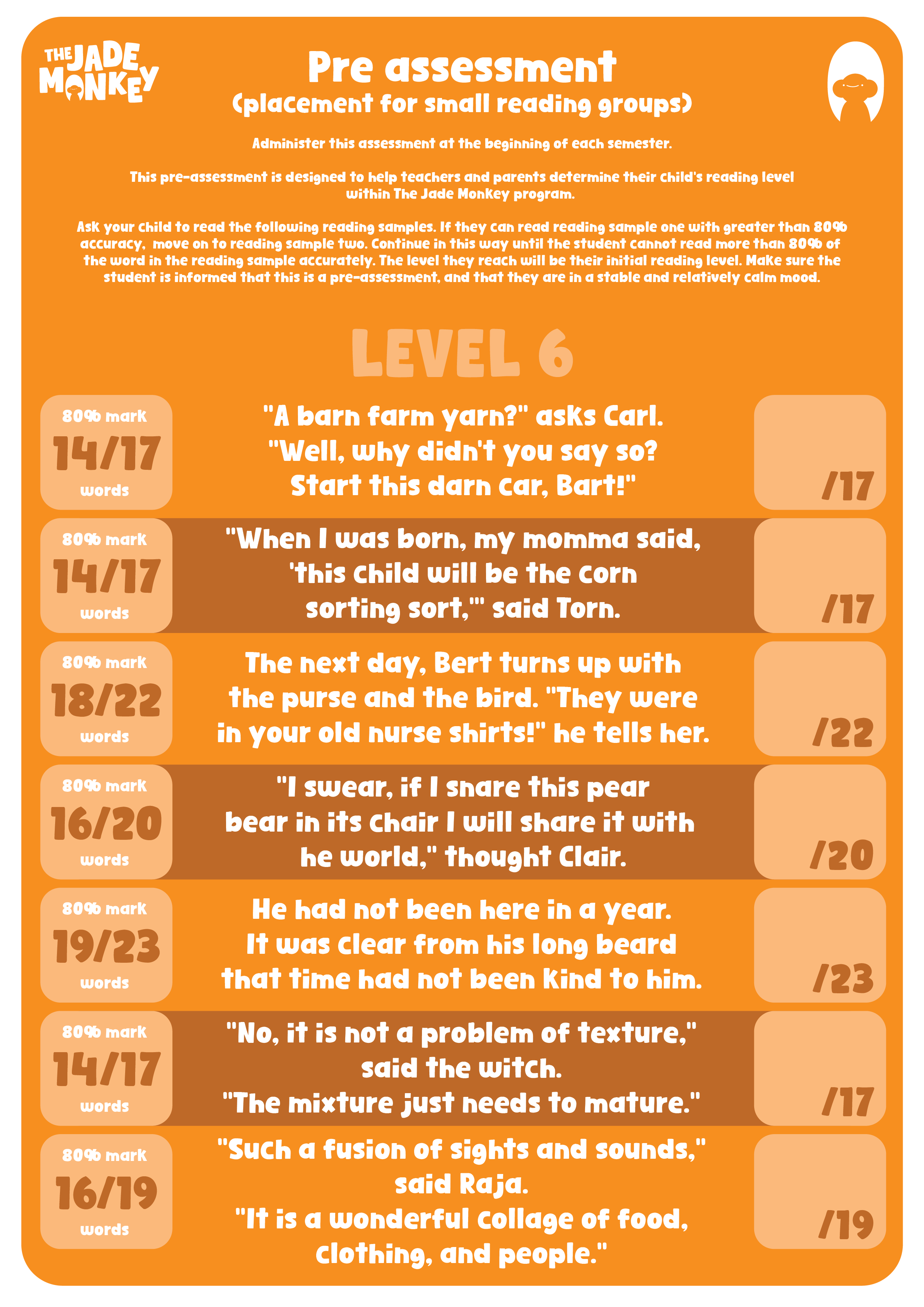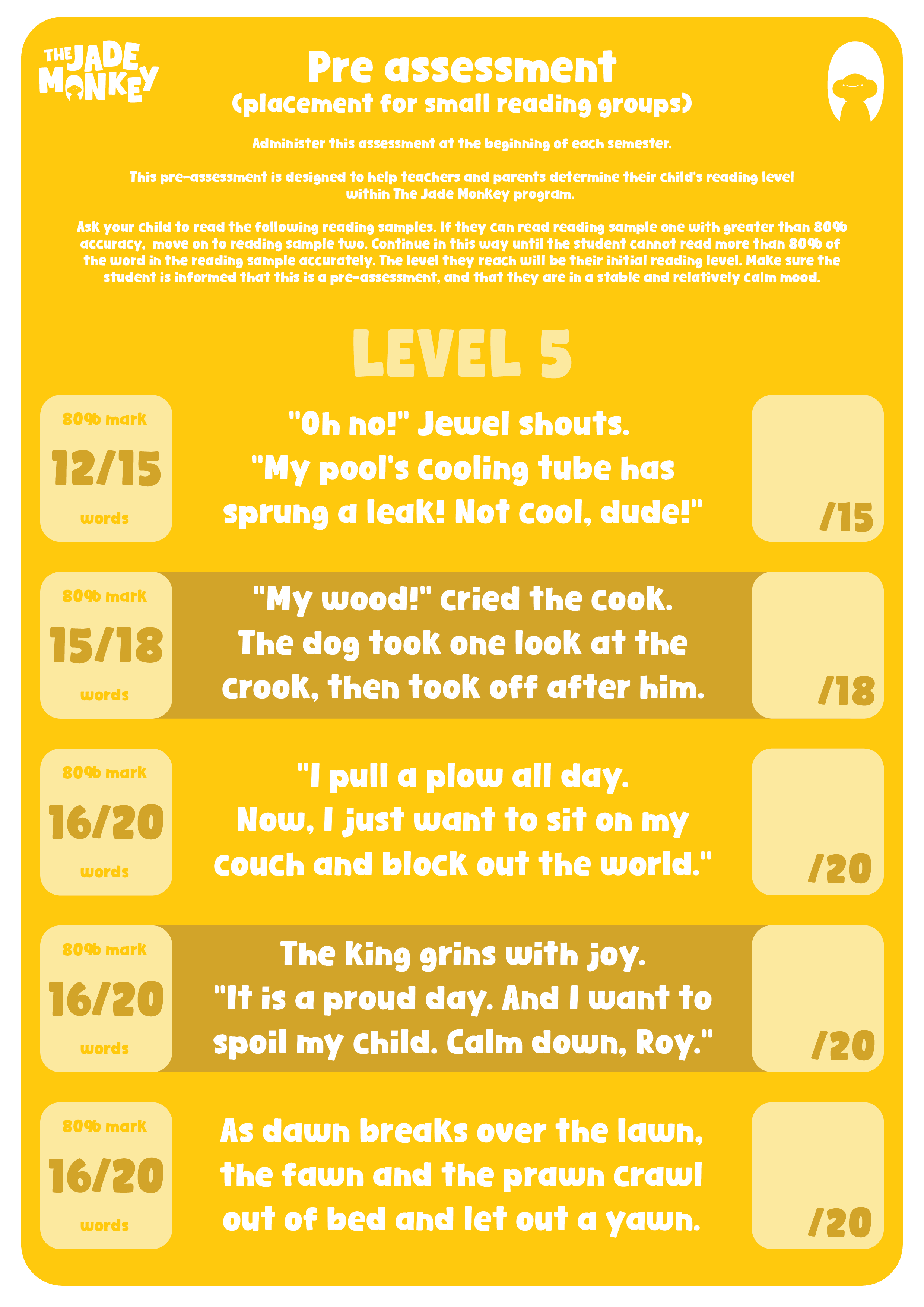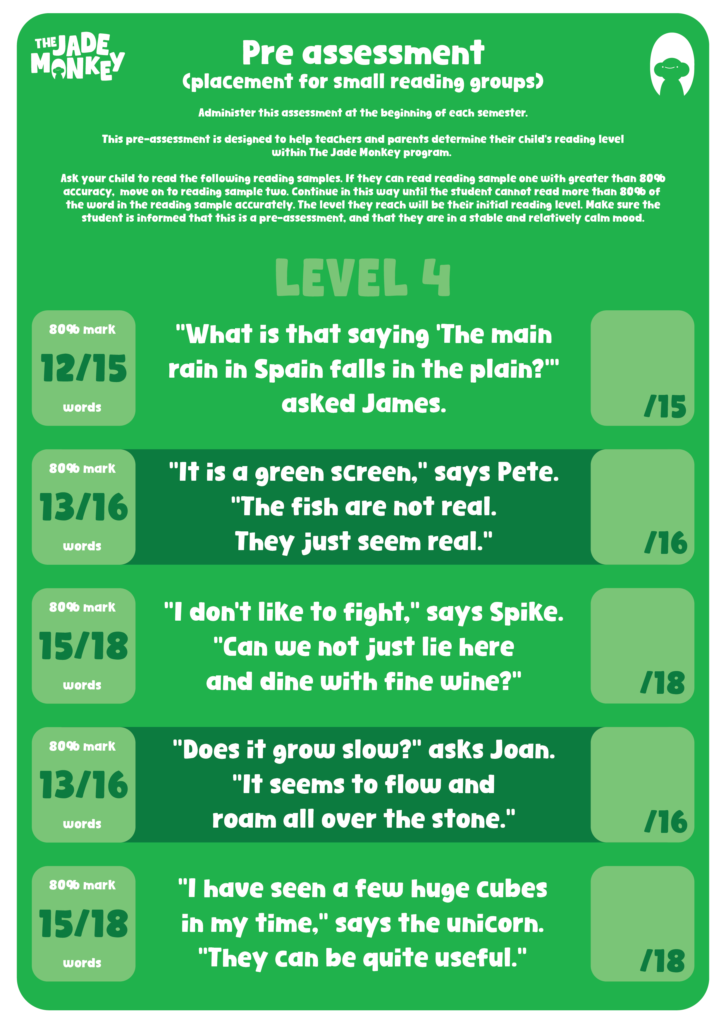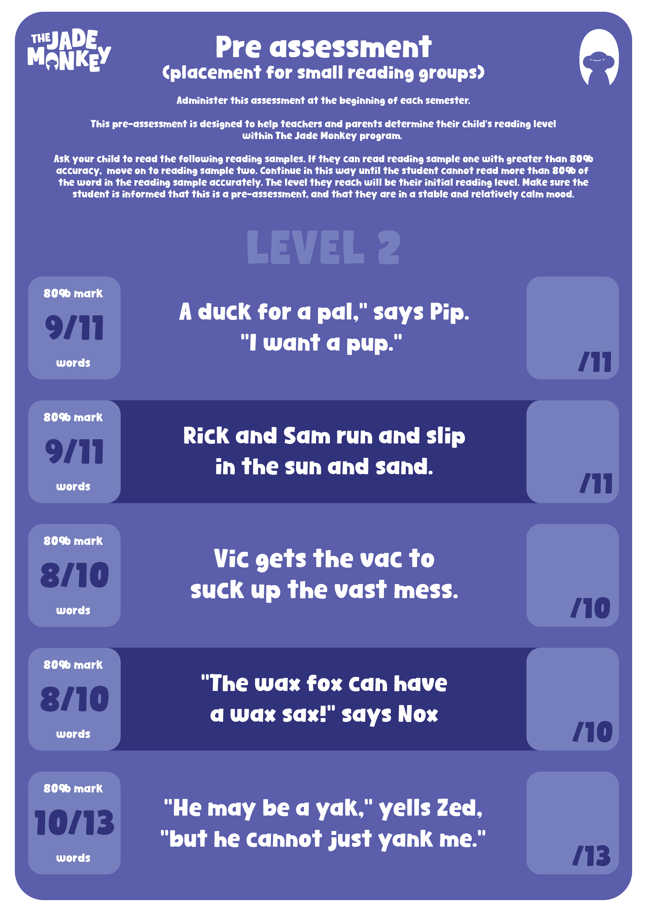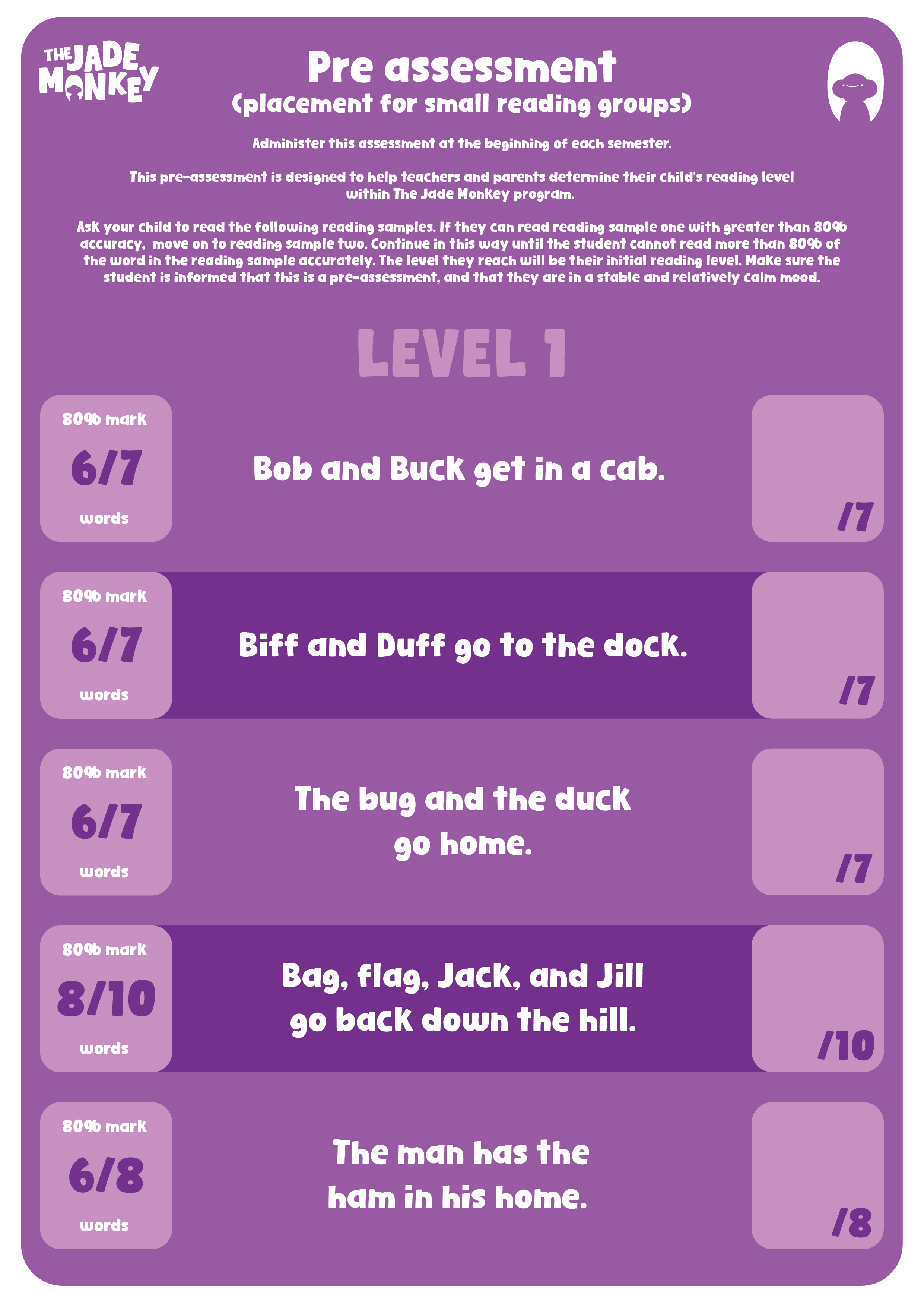 This pre-assessment is designed to help teachers and parents determine their child’s reading level within the Jade Monkey program.